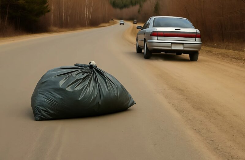 Out of nowhere, a car appeared ahead, crawling slowly along the shoulder. Something about it felt off. Suddenly, the rear door cracked open, and a large black trash bag was tossed onto the roadside. Without pause, the vehicle sped away and vanished around the bend.
