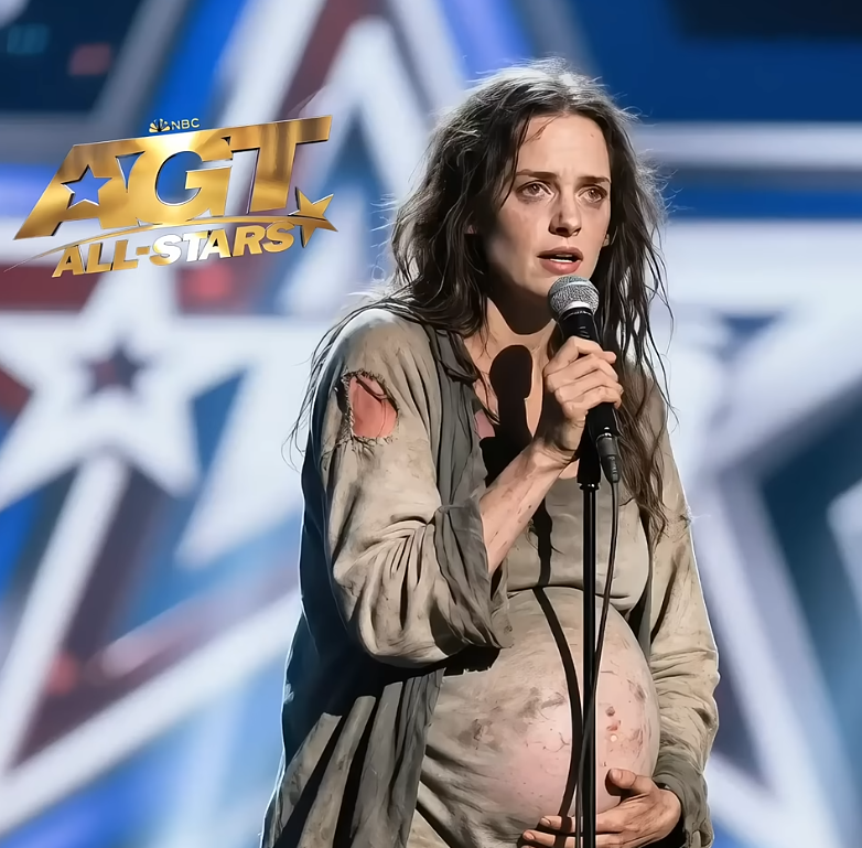 A woman, barefoot and dressed in torn clothes, stepped onto the stage. Her face was weary, and her arms were gently wrapped around her pregnant belly.