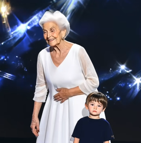 She wore white, like a soft echo from a different era—graceful, dignified. Her silver hair framed her face gently as she walked onto the stage with a little boy—perhaps her grandson, or maybe someone else’s child, but undoubtedly someone she held dear.