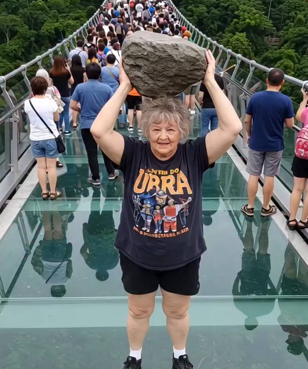 When the group arrived, Svetlana — in her trademark “URRA!” T-shirt featuring Soviet-style superheroes — immediately drew attention. She confidently stepped onto the transparent panels of the bridge and playfully lifted a decorative fake rock placed near the entrance. These props were meant for tourists to pose with — to pretend to “break” the glass. All in good fun.