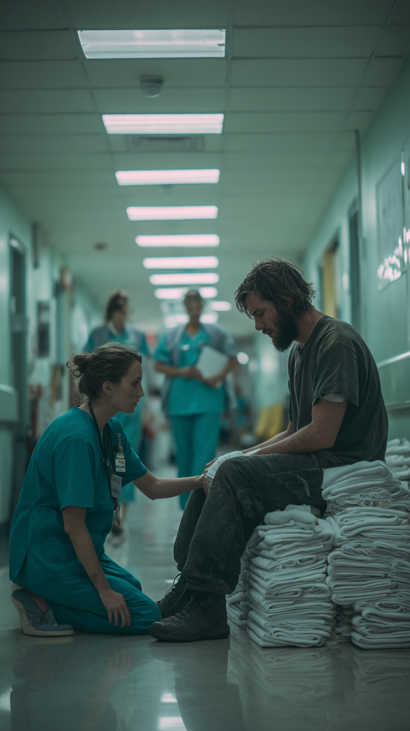 In the controlled chaos of the ER, Emma worked with practiced efficiency. She cleaned the grime from a shallow cut on his forehead, wrapped him in layers of warm blankets, and held a cup of hot broth to his chapped lips. He said nothing, but his eyes followed her every move, filled with a silent, unnerving intensity. Before a doctor discharged him hours later, she slipped her hand into her pocket, pulling out the last twenty dollars she had for the week.