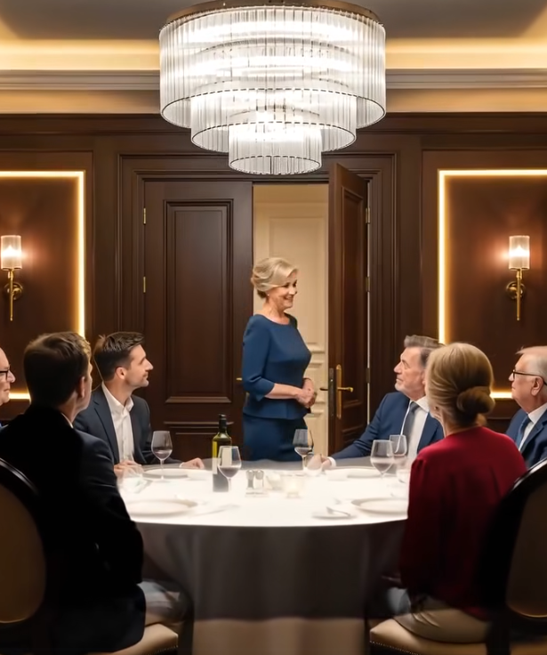 The moment Lewis opened the doors, a hush rippled through the room. Laughter faded. Silverware paused mid-air. Mason, who had just finished his toast, choked slightly, his face draining of color. Cora’s smile faltered. Clara’s wine glass trembled.