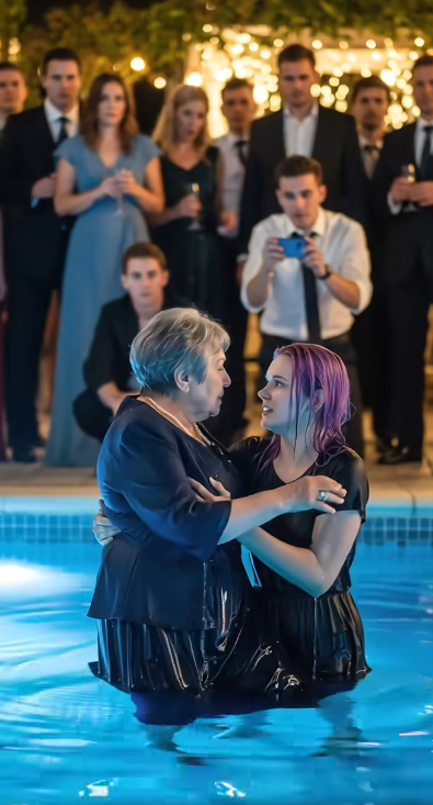 She didn’t know how long she sat there until a commotion made her open her eyes. People were laughing and pointing at the pool. An elderly lady was in the water, fully dressed, struggling to cling to the slippery edge. Her elegant navy-blue dress was heavy with water, and her white hair was soaked.