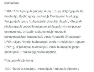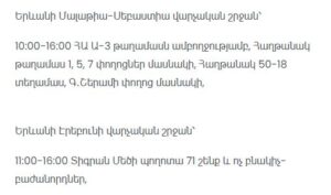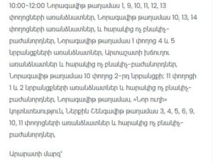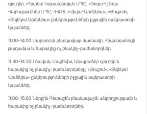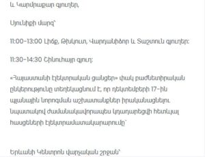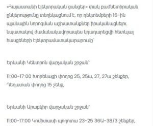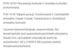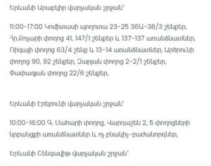 “Electric Networks of Armenia” CJSC informs consumers that due to scheduled maintenance works, electricity supply will be temporarily suspended at the following addresses.