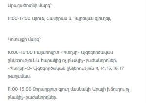 11:00–15:30 — Artashat city (Nersisyan, Mamikonyan streets), Mrgavet village (partial)