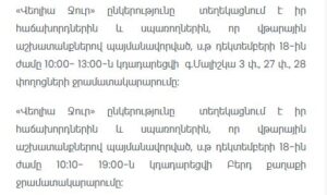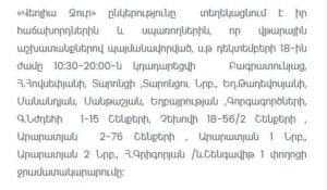 Additionally, due to emergency repair works, water supply will be suspended in the city of Berd on December 18 from 10:10 to 19:00.