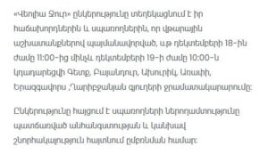 According to the announcement, on December 18 at 11:00 AM, water service will be interrupted in the villages of Getk, Bayandur, Akhurik, Arrapi, Yerazgavors, and Gharibjanyan.