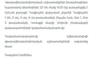 The suspension affects gas consumers in Yerevan’s Davtashen administrative district, including Davtashen 1st, 2nd, 3rd, and 4th residential blocks, as well as Dzor 1 and Dzor 2 neighborhoods. In addition, gas supply has also been temporarily halted for consumers in the settlement of Zovuni in Kotayk Province.