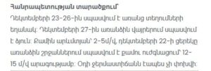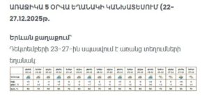 From December 23 to December 27, Yerevan is expected to experience dry weather with no precipitation. Weather conditions will remain generally stable throughout the period.