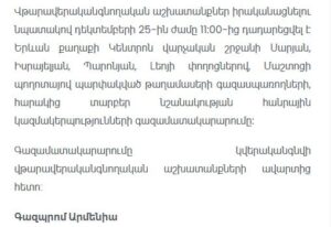 The affected area includes the neighborhoods surrounded by Saryan, Israelyan, Paronyan, Leo streets and Mashtots Avenue, as well as nearby organizations and public facilities.