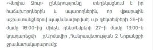 Veolia Jur has informed its customers and consumers that due to emergency repair works, the water supply in Armavir City, specifically in Hanrapetutyan 2nd Lane, will be temporarily suspended from December 26, 16:00, until December 27, 13:00.