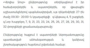 Veolia Jur has informed its customers that due to emergency repair work, water supply will be temporarily suspended on December 27 from 09:30 to 20:00 in the following areas: