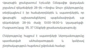 Veolia Jur has informed customers that due to emergency repair work, water supply will be temporarily suspended on December 28, from 13:00 to 18:00, in the following area of Yerevan:
