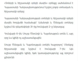 January 6 is celebrated as the Feast of the Nativity and Theophany (Armenian Christmas), and this day is also a non-working day.