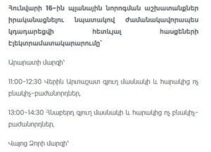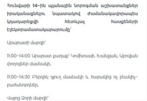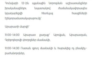11:00-14:00 – Ararat town: Abovyan, Araratyan, Griboyedov streets (partially)