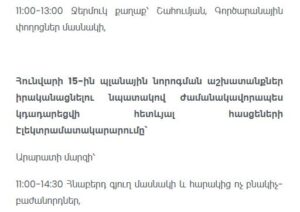 11:00-13:00 – Vayk town: “Television Station” (non-residential), Jermuk: Vardanyan, Shahumyan, Myasnikyan streets (partially)
