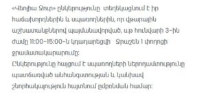 According to the notice, the water supply to Jrashen 1st Street will be suspended on January 3, from 11:00 to 15:00. The interruption is necessary to carry out urgent repair activities aimed at ensuring the reliable operation of the water distribution system.
