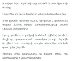 On January 6, the Armenian people celebrate the birth of Jesus Christ. Armenian Christmas is marked not only by religious observance but also by long-standing culinary traditions passed down through generations.