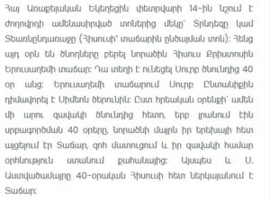 Every year on February 14, the Armenian Apostolic Church celebrates the Feast of the Presentation of the Lord, known as Tyarnndarach, marking forty days after the birth of Jesus Christ.