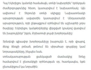 Alongside its religious significance, Tyarnndarach is also rich in folk traditions. One of the most well-known customs is lighting a bonfire, often made from wheat stalks, around which people gather to celebrate. Women traditionally bring festive foods such as pokhindz (roasted wheat flour), raisins, aghants, walnuts, and roasted chickpeas, circling the fire with trays before sharing part of the food and saving the rest for the evening meal.