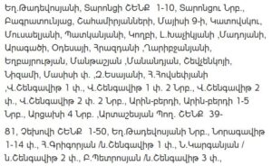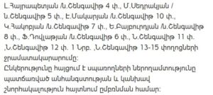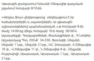 The temporary water outage will affect the following streets and residential areas, including but not limited to: Gorgagortsneri Street, Tamantsineri Street, G. Nzhdeh Street, Arshakunyats Avenue (buildings 34–330), Frunze Street, Sevan Street and adjacent lanes, Sm. Zoravari Street, Verin and Nor Shengavit streets and lanes, Mkhchyan, Baydukov, Araratyan streets and lanes, Yeghishe Tadevosyan Street and lane, Tarontsi buildings and lane, Bagratunyats, Shahamiryanneri, Mayisi 9-i, Katovski, Musaelyan, Patkanyan, Koghbi, L. Khachikyan, Madoyan, Aragatsi, Odesayi, Hrazdani, Gharibjanyan, Yeghbayrutyan, Mantashyan, Manandyan, Shevchenko, Nizami, Masisi, Z. Yesayan, H. Hovsepyan streets, Arin-Berd streets and lanes, Artashesyan Avenue (buildings 39–81), Chekhov Street (buildings 1–50), Noragavit streets, as well as multiple residential lanes in the Nor Shengavit area.