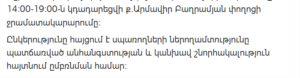 Water supply will be suspended from 13:00 to 16:00 in the following areas of Vanadzor: