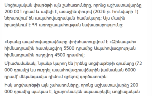 According to the ministry, beneficiaries whose monthly salary is 200,001 AMD or higher will be included in the insurance system during the first phase, starting January 1, 2026.
