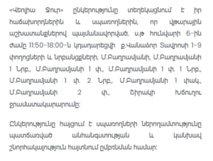 09:30–16:00 – Water supply interruption on Tserentsi Street and A. Ghulyan / Shahumyan 6 Streets.