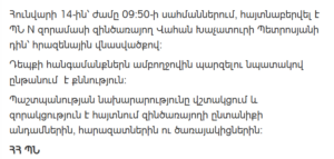 The Ministry of Defense of the Republic of Armenia has expressed its condolences and support to the serviceman’s family members, relatives, and fellow servicemen.
