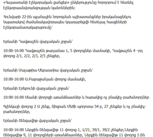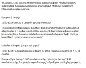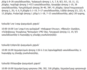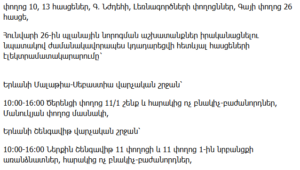 10:00–16:00 – Partial outages on Shinarnery, Estonian, Arakelyan, Abelyan, Kh. Khachatryan Streets