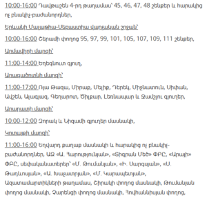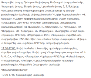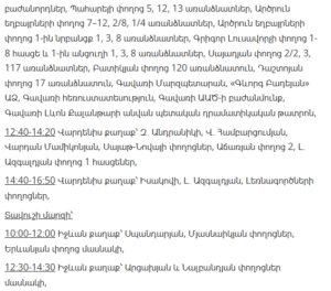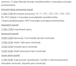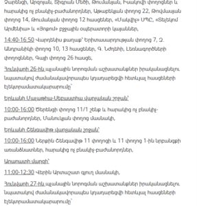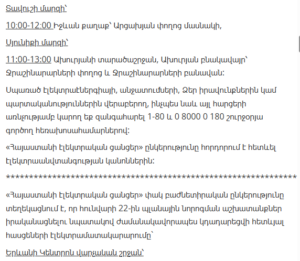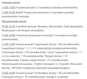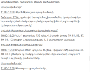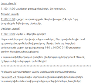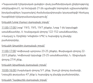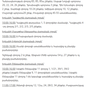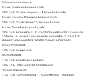 “Electric Networks of Armenia” CJSC informs customers that, due to scheduled maintenance works, electricity supply will be temporarily suspended in several districts of Yerevan and various regions of Armenia between January 21 and January 27.