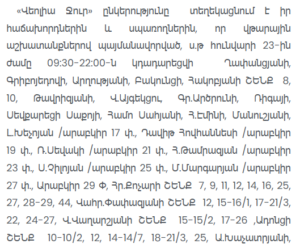 Veolia Water CJSC informs its customers and consumers that due to emergency repair works, on January 23 of this year, from 09:30 to 22:00, the water supply will be temporarily suspended at the following addresses in Yerevan: