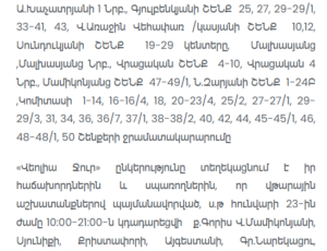 Additionally, due to emergency works, on January 23, from 10:00 to 18:00, the water supply will be suspended on Margaryan Street.