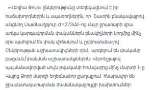 Veolia Water informs its customers and consumers that the regulating valves on the Satnaghbyur main water pipeline (Ø273 mm) passing through the settlement of Shatin remain closed by local residents. According to the company, residents have obstructed access to the valves and prevented company staff from carrying out opening and closing operations.