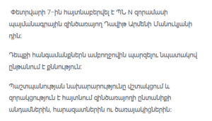 On February 7, the body of contract serviceman David Armeni Manukyan from Military Unit No. N of the Ministry of Defense was discovered.