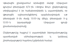 Veolia Water has informed customers that due to emergency repair works, the water supply in Mrgashat village, Armavir region will be temporarily suspended from 13:00 on February 8 until 12:00 on February 9.