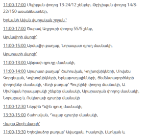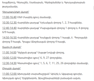 Outages are also scheduled in the regions of Armavir, Ararat, Vayots Dzor, Kotayk, Gegharkunik, Tavush, and Shirak, affecting specific towns, villages, and service facilities as announced by the utility provider.