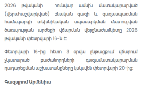 Gazprom Armenia has announced that the payment deadline for natural gas supplied (or recalculated) in January 2026, as well as for technical maintenance services of gas consumption systems, is February 16, 2026.