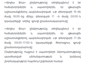 Due to emergency works, water supply in Arinj village will be suspended on February 16 from 18:00 until 00:00 on February 17.