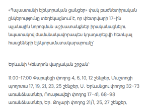 Electric Networks of Armenia CJSC has announced scheduled maintenance works that will lead to temporary power outages in multiple districts of Yerevan and several regions of Armenia on February 17.