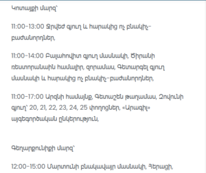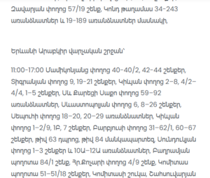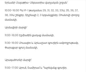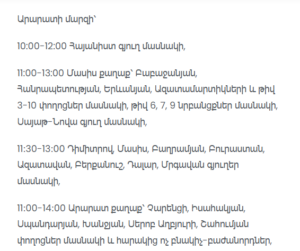 11:00–13:00 Masis (Babajanyan, Republic, Yerevanyan, Azatamartikner streets, streets 3–10 and lanes 6, 7, 9 – partial), Sayat-Nova village (partial)