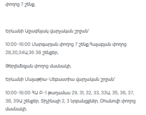 Parpetsi St. 4, 6, 10, 12; Mashtots Ave. 17, 19, 21, 23, 25; St. Yeghyants St. private houses 32–73; Rustaveli St. private houses 17–41, 68–98; Yer. Kochari St. 21/1, 25, 27; Zavyaryan St. 57/19; Kond district (partial outages of private houses 34–243 and 19–189).