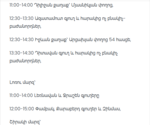 11:30–16:00 Araksavan and Hovtashen villages; Mkhchyan and Mrgavet villages (partial)