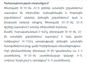 Air temperatures are expected to rise by 2–3°C on February 18, followed by a gradual decrease of 4–5°C on February 19–20. In Lori, Tavush, and Syunik regions, temperatures may drop more sharply, by 6–9°C.