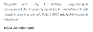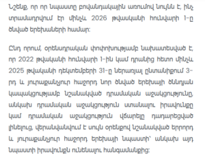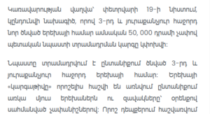 At the Government session scheduled for February 19, a draft decision will be adopted to amend the procedure for providing a monthly state allowance of 50,000 AMD for the third and each subsequent newborn child.