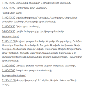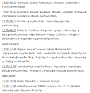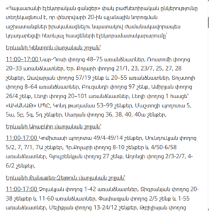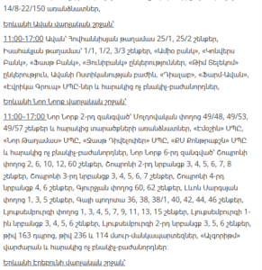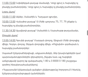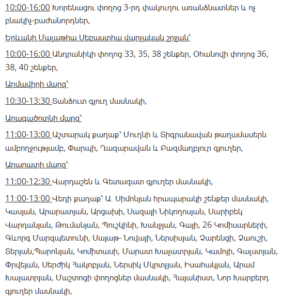11:00–13:00 – Ashtarak (Mughni and Tigranavan districts – full), Parpi, Ghazaravan, Bazmaghbyur villages