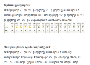 Dry weather is expected in Yerevan on February 21, during the night of February 22, and during the daytime of February 23. Short periods of rain are forecast for the evening of February 22, the night of February 23, and on February 24–25.