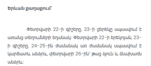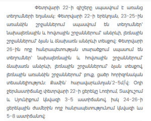 Winds are expected from the southwest at 2–5 m/s. Daytime air temperatures on February 22 are forecast to decrease by approximately 3–5°C in Lori, Tavush, and Syunik regions. Further decreases of around 5–8°C during daytime hours are expected across the country between February 24 and 26.