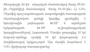 On February 24 at 05:33 local time (01:33 GMT), the seismic network of the Territorial Service for Seismic Protection of the Ministry of Internal Affairs of Armenia recorded a minor earthquake.