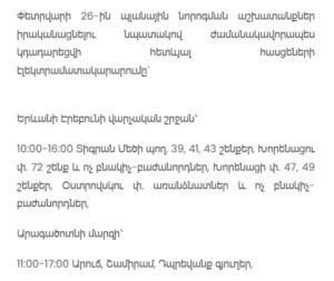 Electric Networks of Armenia has informed customers that, due to planned maintenance works, electricity supply will be temporarily suspended in several areas on February 26 and 27.